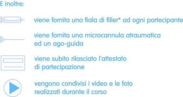 - 1 fiala monopaziente (solitamente da 1 ml) di filler dermico riassorbibile a base di acido ialuronico competamente riassorbibile da utilizzare nel corso.